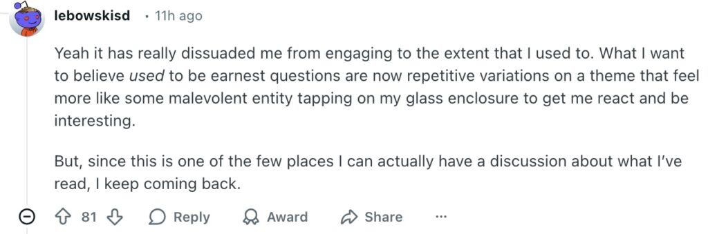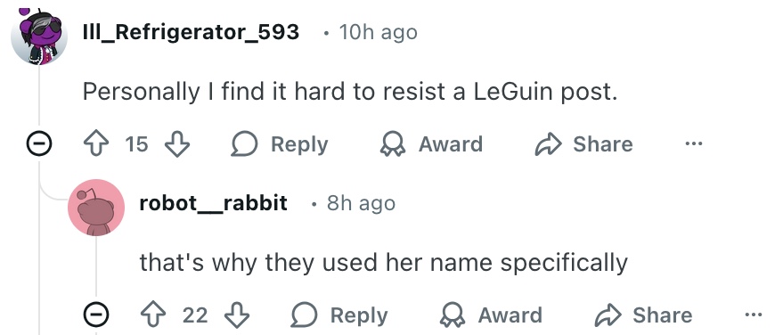 Somebody finally said in /r/printSF something I’ve been suspecting–and I do love it when my kneejerk gut takes are proven to be Correct and Wise. There has been a flood of posts fishing for the sort of answer your English teacher would want you to give about a book in AP English, written in AI style. I had not pursued it–my response to my own AI paranoia has been to disengage from everything, which is healthy for somebody who already has a tendency to be a recluse–but of late what were once the last bastions resembling old school message boards on the internet for niche ephemera (the wall-of-text subreddits) are just not engaging me, even though they are trying to start discussions that are in my wheelhouse (Le Guin, Wolfe, old school ‘literary’ scifi, the weeds of theory, etc). The posts have the tenor of a recent convert to the beauty of literature, a pilgrim coming to confess and pray at the altar, seeking the fellowship and validation of the congregation. And, as people generally believe their ‘religions’ are good and should be appreciated more, this is an excellent way to engage them. Yes, including me.
