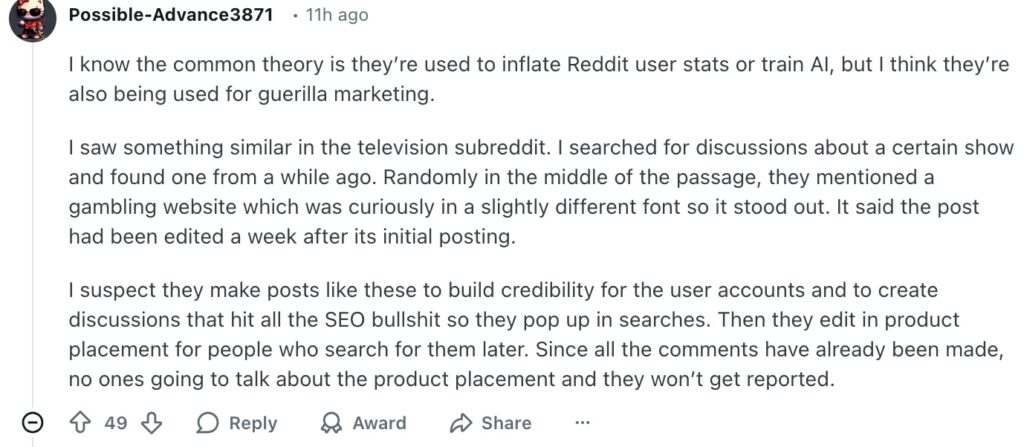 I’m seeing this pilgrim-crawling-to-the-altar and “hello fellow kids” everywhere now even more than I once was; it was bad enough when I suspected people of karma farming and astroturfing, but it was at least a human putting the work in–I could only hope, sometimes, a human who was asking some questions they genuinely wanted to ask as part of their karma-farming, something. Now we are also being triggered into providing some deep, insightful discussions to train an AI algorithm to have deep, insightful discussions. In any case, OP made an astute observation with some concrete evidence of seeding, with more being added down the thread.