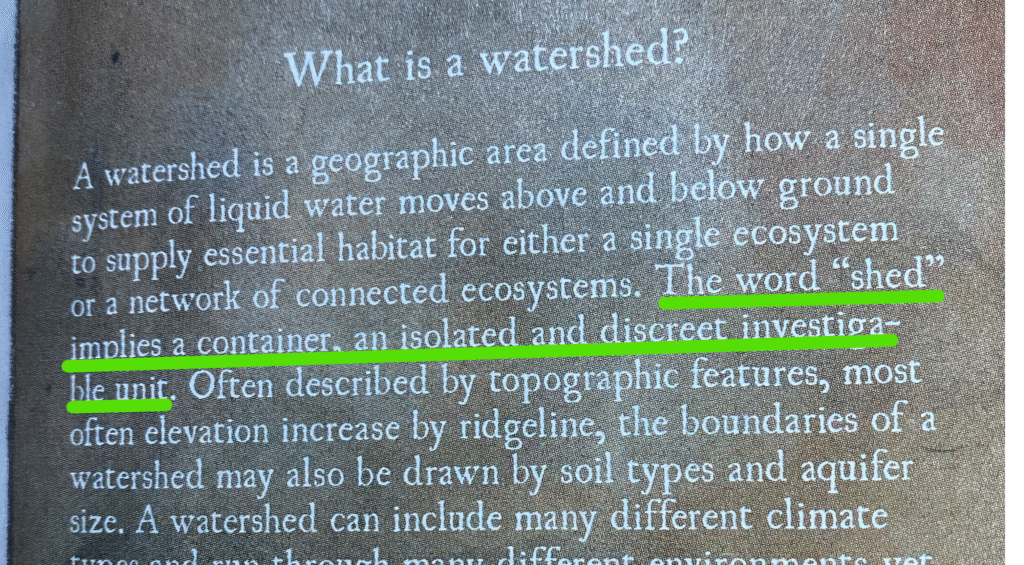 I always associated ‘shed’, in the context of ‘watershed’, with sloughing something off, shedding it like a skin. So, when I saw ‘watershed’ on a map I pictured the going-to place for water, where water sheds off mountains and hills and the like. But I always wondered why the word focused on the “shedding” aspect rather than the “holding” aspect. Because of this, I associated the term “watershed” with movement-toward, coming-together, flux–and maybe that is more accurate than the stable stagnant ‘pool’ I admit I picture when I think of a water shed. The only water I’ve seen in ‘sheds’ (as in a freestanding rough storage structure) is standing mosquito-hosting muck. Maybe my mistaken etymology was actually an insight? I think I’ll go with that.